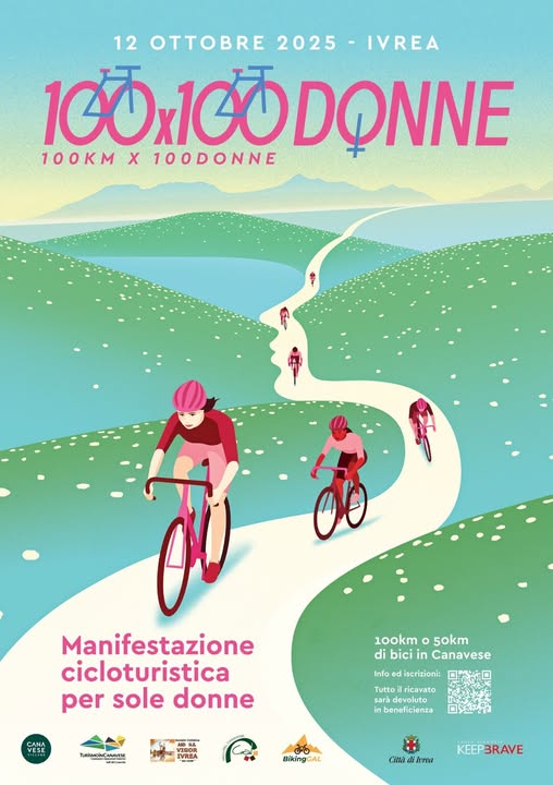 Domenica 12 ottobre 2025 si è svolto l’evento cicloturistico non competitivo, riservato soltanto alle donne, denominato 100 x 100 donne, con partenza e arrivo a Ivrea con un itinerario che ha abbracciato parte dell’anfiteatro morenico per circa 100 chilometri di percorso.