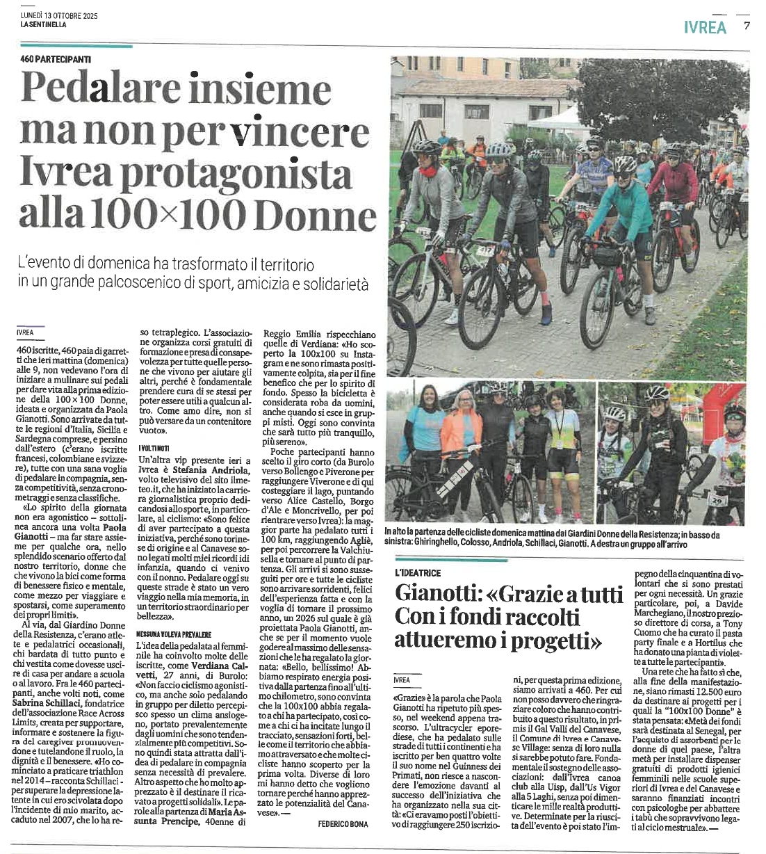 Domenica 12 ottobre 2025 si è svolto l’evento cicloturistico non competitivo, riservato soltanto alle donne, denominato 100 x 100 donne, con partenza e arrivo a Ivrea con un itinerario che ha abbracciato parte dell’anfiteatro morenico per circa 100 chilometri di percorso.