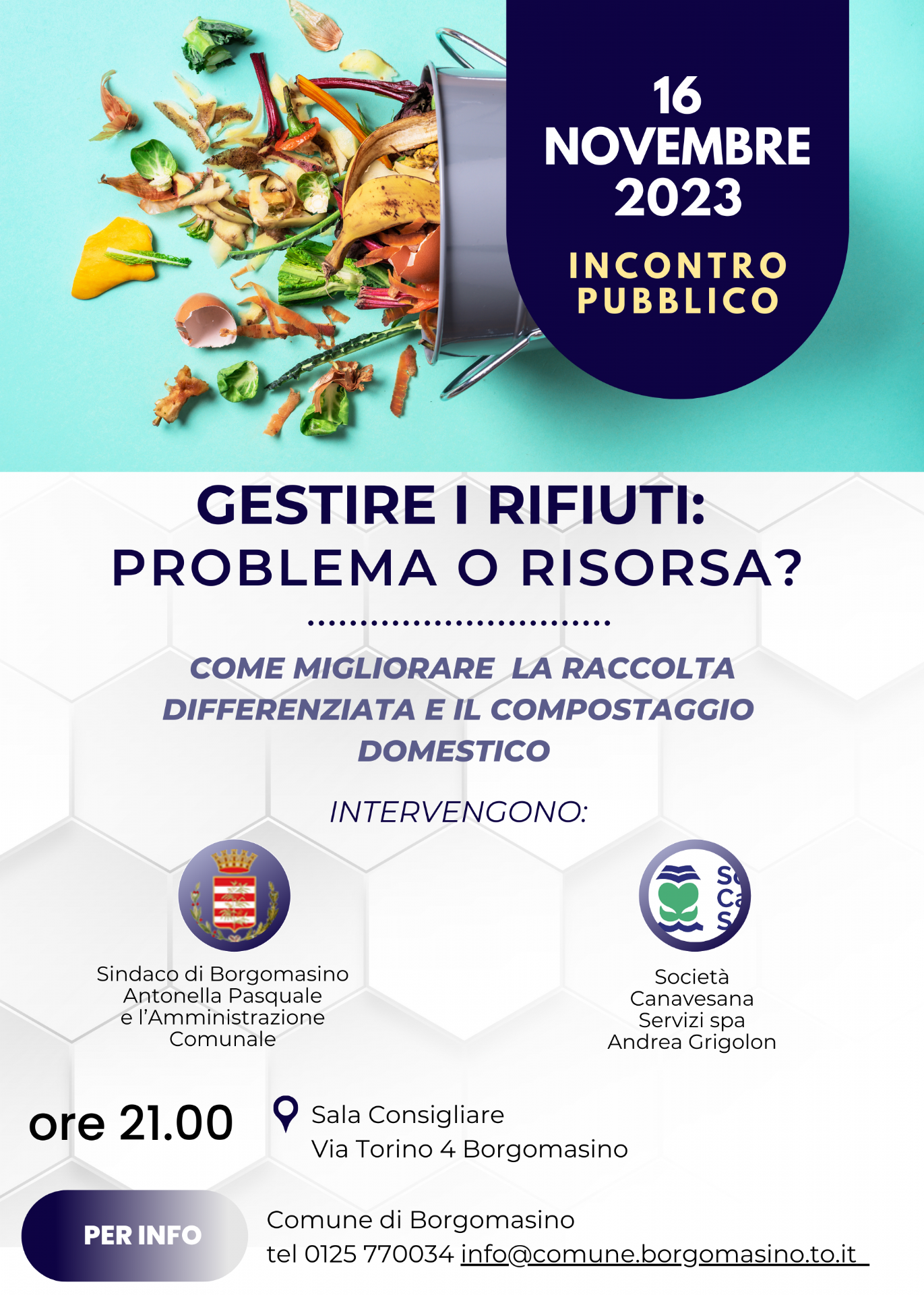 L'Amministrazione comunale di Borgomasino insieme con la Società canavesana servizi invitano la cittadinanza a partecipare all'incontro pubblico dal titolo Come migliorare la raccolta differenziata e il compostaggio domestico, che si terrà giovedì 16 novembre 2023, alle ore 21, presso la Sala consigliare del Palazzo comunale in via Torino, 4 in Borgomasino