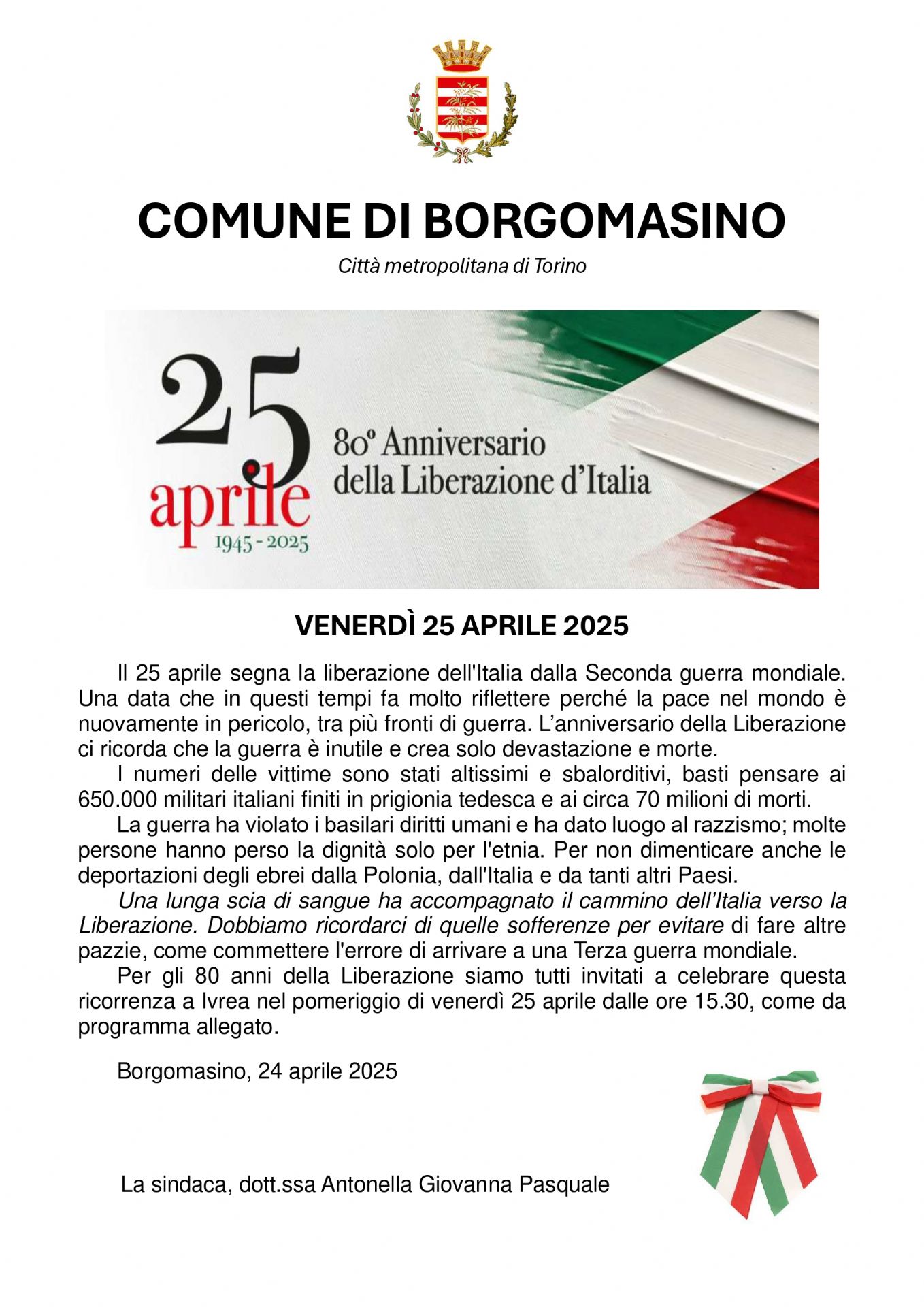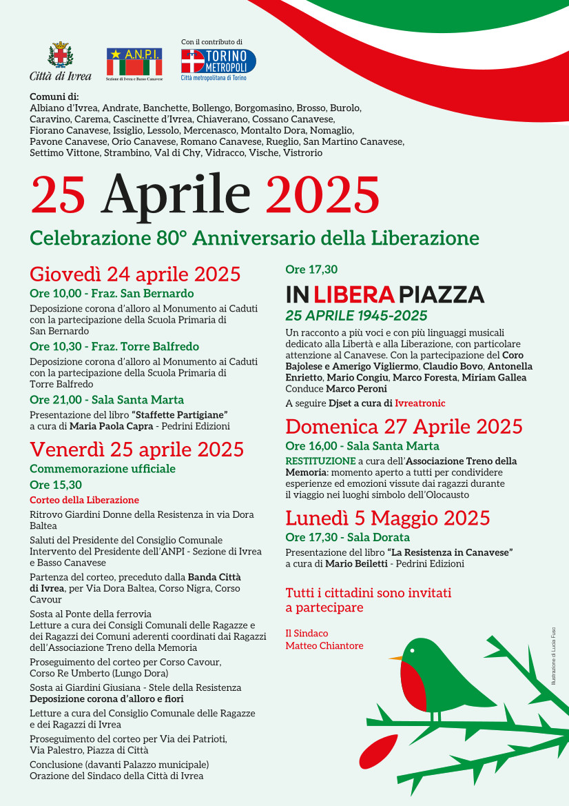 Per gli 80 anni della Liberazione siamo tutti invitati a celebrare questa ricorrenza a Ivrea nel pomeriggio di venerdì 25 aprile dalle ore 15.30, come da programma allegato.