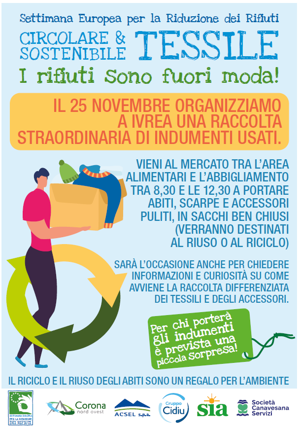 Il 25 novembre presso il mercato di Ivrea tra l’area alimentari e abbigliamento la nostra società sarà presente con un gazebo informativo e un mezzo adibito alla raccolta degli abiti usati in cui i cittadini potranno conferire direttamente sul posto i propri indumenti usati in sacchi ben chiusi, ricevendo in omaggio una borsa di stoffa e il pieghevole informativo sulla raccolta differenziata dei tessili. Sarà l’occasione per incontrare gli utenti, rispondere a dubbi e curiosità e fornire loro informazioni.
